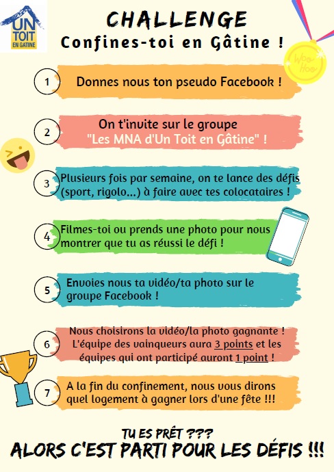 Des défis leurs sont donc proposés régulièrement via des vidéos postées chaque lundi, mercredi et vendredi. Les participants choisissent de relever le défi en postant à leur tour une vidéo sur le groupe dans le but de faire gagner leur équipe (composée de tous les colocataires d’un même logement). Un système de points est mis en place afin de récompenser l’équipe gagnante mais également celles qui ont tenté de relever le défi. La finalité de ce challenge serait notamment de pouvoir organiser une fête de « déconfinement » afin de pouvoir se retrouver après cette période difficile, et lors de laquelle l’équipe gagnante se verrait remettre la « coupe ».
